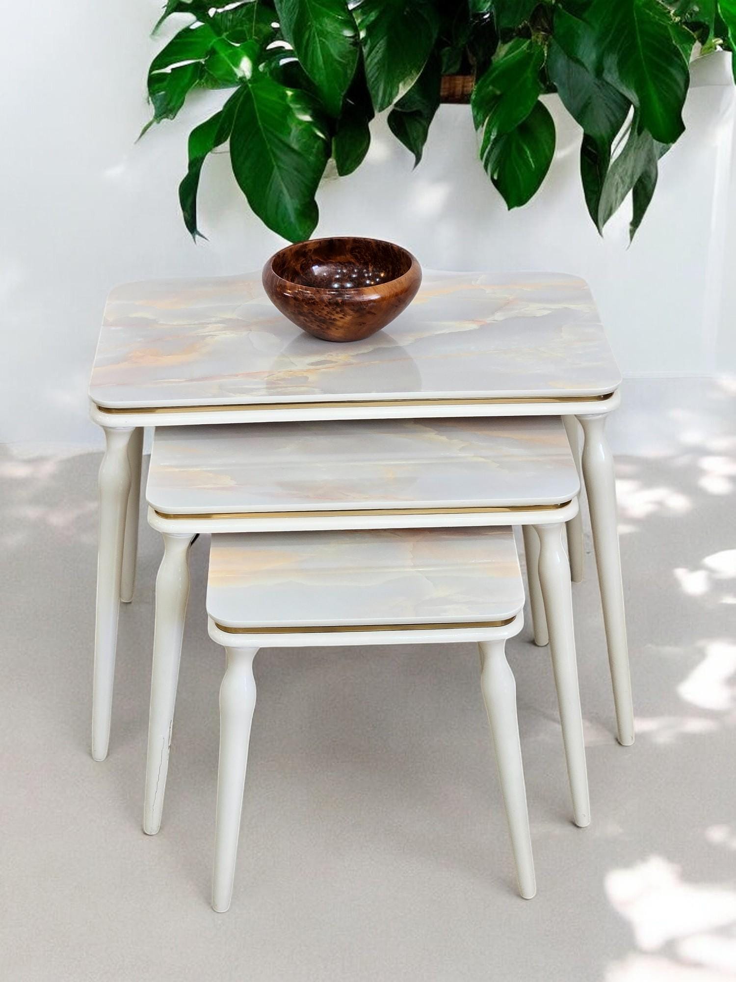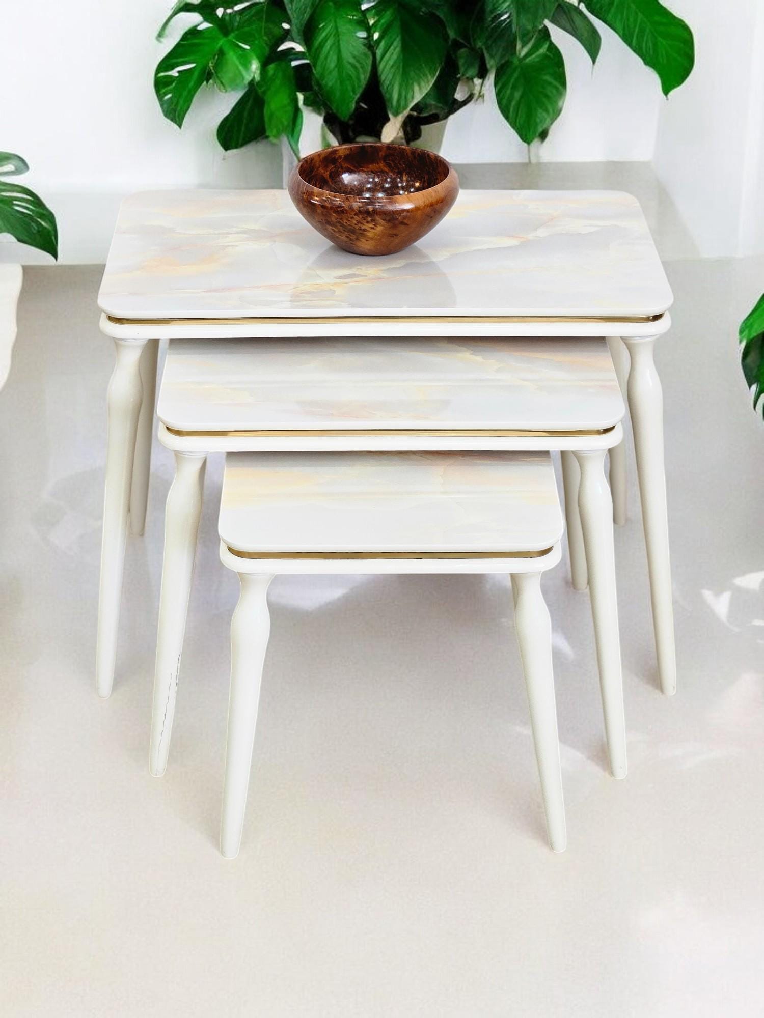 • Elegance and Ergonomics: This custom design 3-piece nesting table beautifully combines aesthetics and functionality. Each piece offers a touch of sophistication and practicality, enhancing the elegance of your living room.