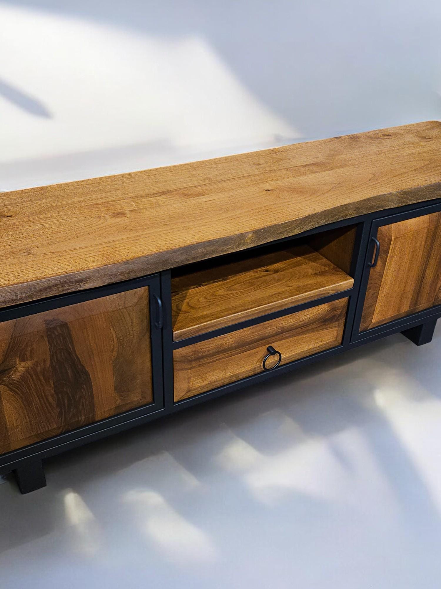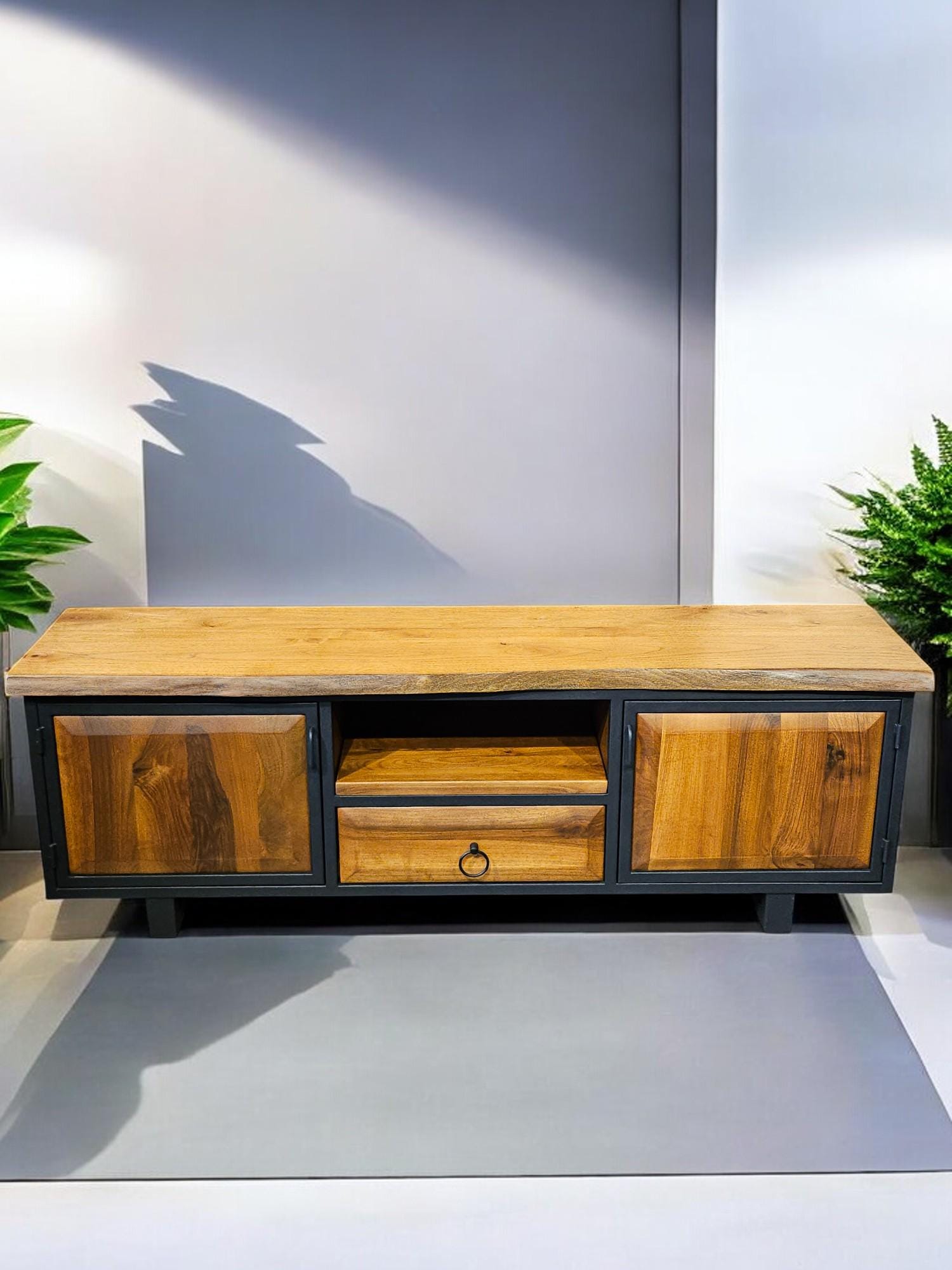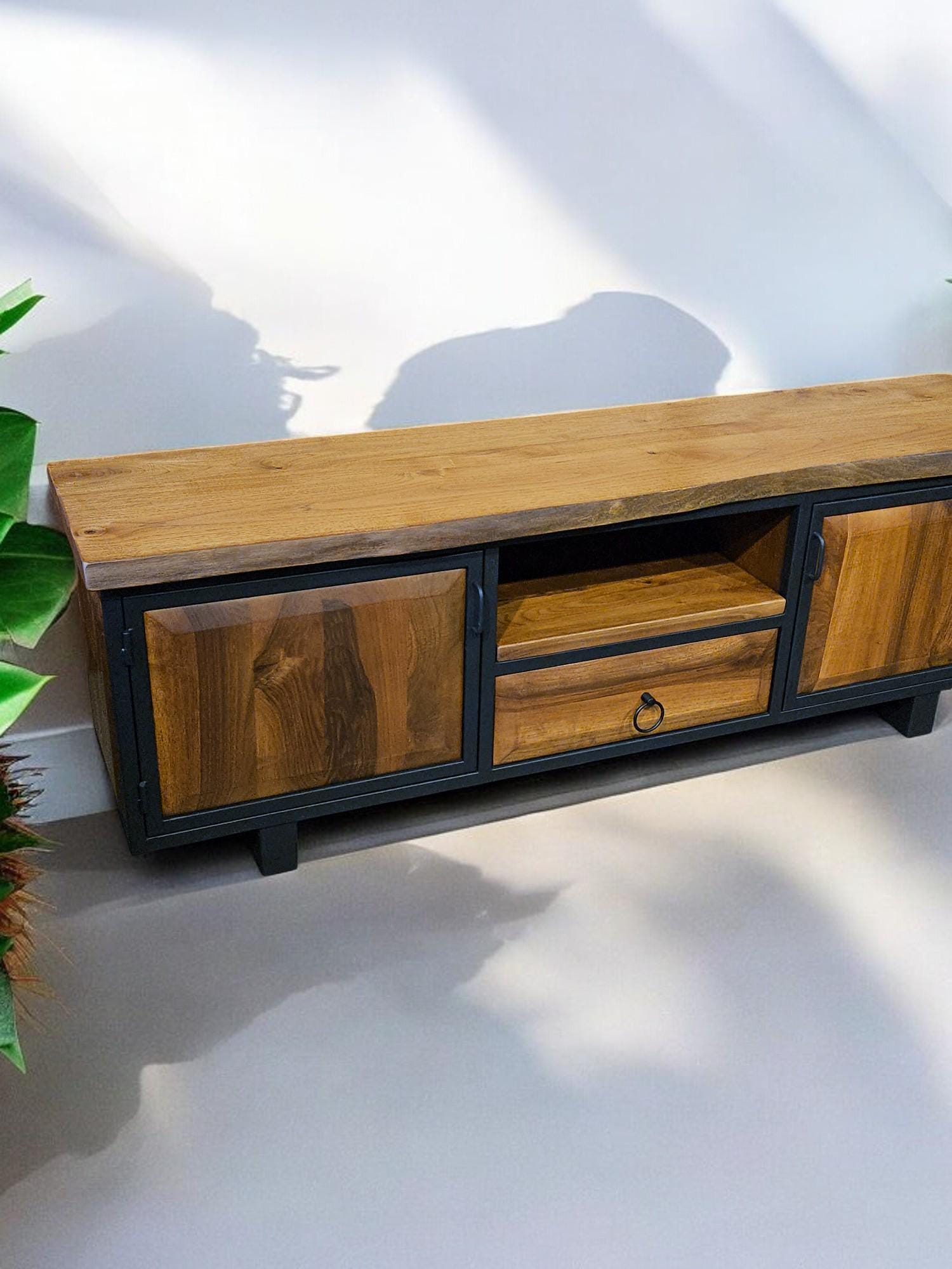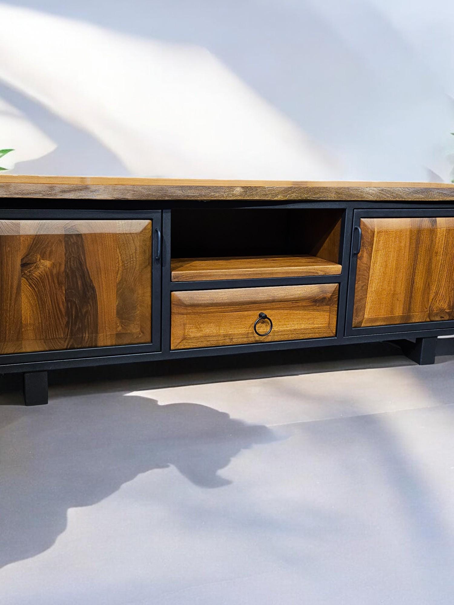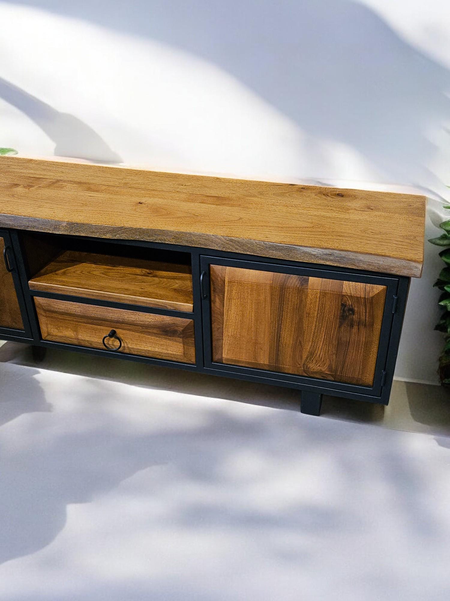 Our handcrafted console storage unit brings together elegance and practicality, made from 100% natural wood and durable iron accents. This unit offers a spacious area that can be used as a stylish TV stand or a storage solution.